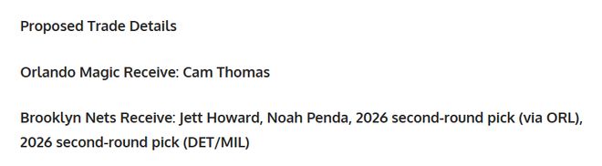 ✅篮网得到:杰特・霍华德、诺亚・彭达、2026年魔术次轮签、2026年活塞/雄鹿次轮签