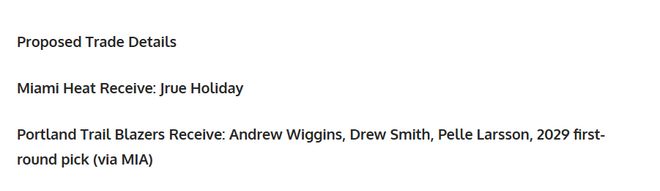 ✅开拓者得到:安德鲁・威金斯、德鲁・史密斯、佩勒・拉尔森、2029年热火首轮签