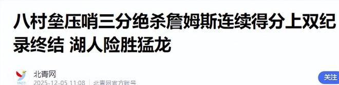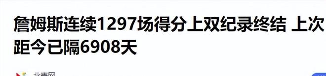 北青网(詹姆斯连续1297场得分上双纪录终结 上次距今已隔6908天2025.12.05)