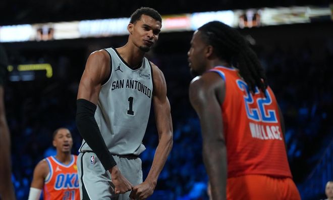 只有作为对手的雷霆,才知道文班亚马是多么恐怖的存在。雷霆本场比赛的阵地战得分仅为84分,远远低于他们的赛季平均,文班犹如一堵叹息之墙,横亘在他们和篮筐之间,赛后采访中,亚历山大心有余悸地表示:“当对手很擅长封锁内线时,我们必须想办法把对手的护筐球员调动到外线和底角,显然,我们在这方面做得不够好。”道理其实大家都懂,问题是文班有着2米26的身高和2米44的臂展,还有着不逊色于锋线一般的移动速度,这防守压迫性,任谁来心里都不免发怵。